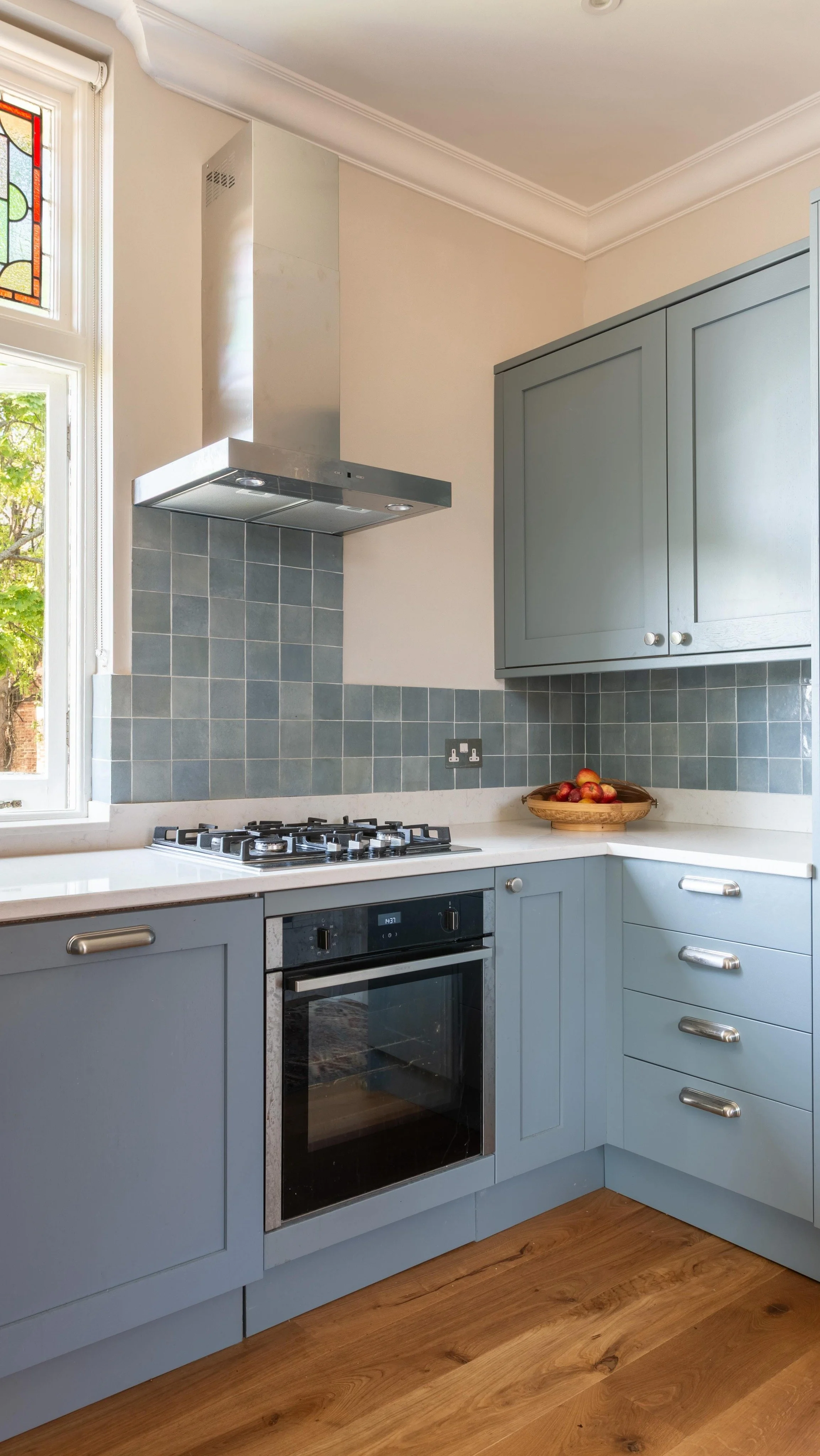Complete renovation of 2 bed apartment in Art Deco block. Full specification of new kitchen bathroom, flooring whilst keeping the period details and restoring key features like the fireplace and windows.
